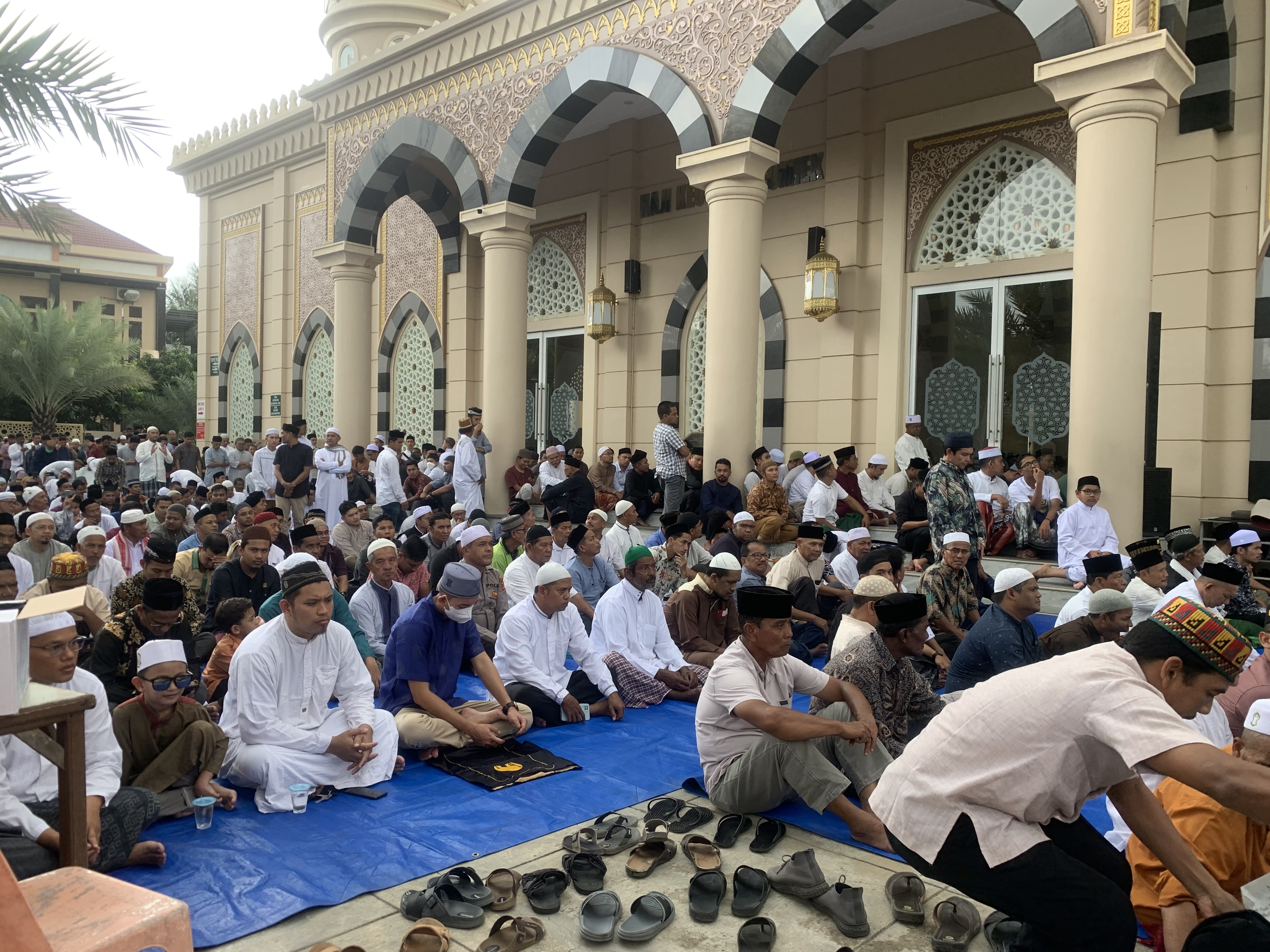 Tidak hanya itu, saat khutbah dimulai jemaah juga masih terus berdatangan. Bahkan, para pengurus masjid terlihat menggelar terpal di halaman masjid untuk jemaah yang tidak kebagian tempat di dalam masjid.