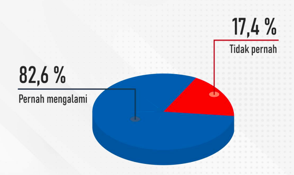 Dari jumlah yang pernah mendapat kekerasan seksual tersebut, mayoritas (37 persen) mengalaminya di ranah daring sekaligus luring, di ranah daring saja 26,8 persen dan luring saja 18,2 persen.
