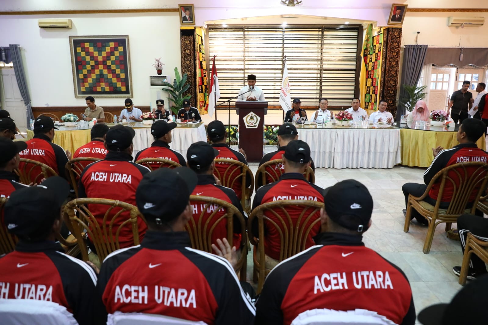 Penjabat Bupati Aceh Utara Azwardi melepaskan 117 atlet yang akan mengikuti bertanding di PORA Pidie di Pendopo Bupati Aceh Utara.