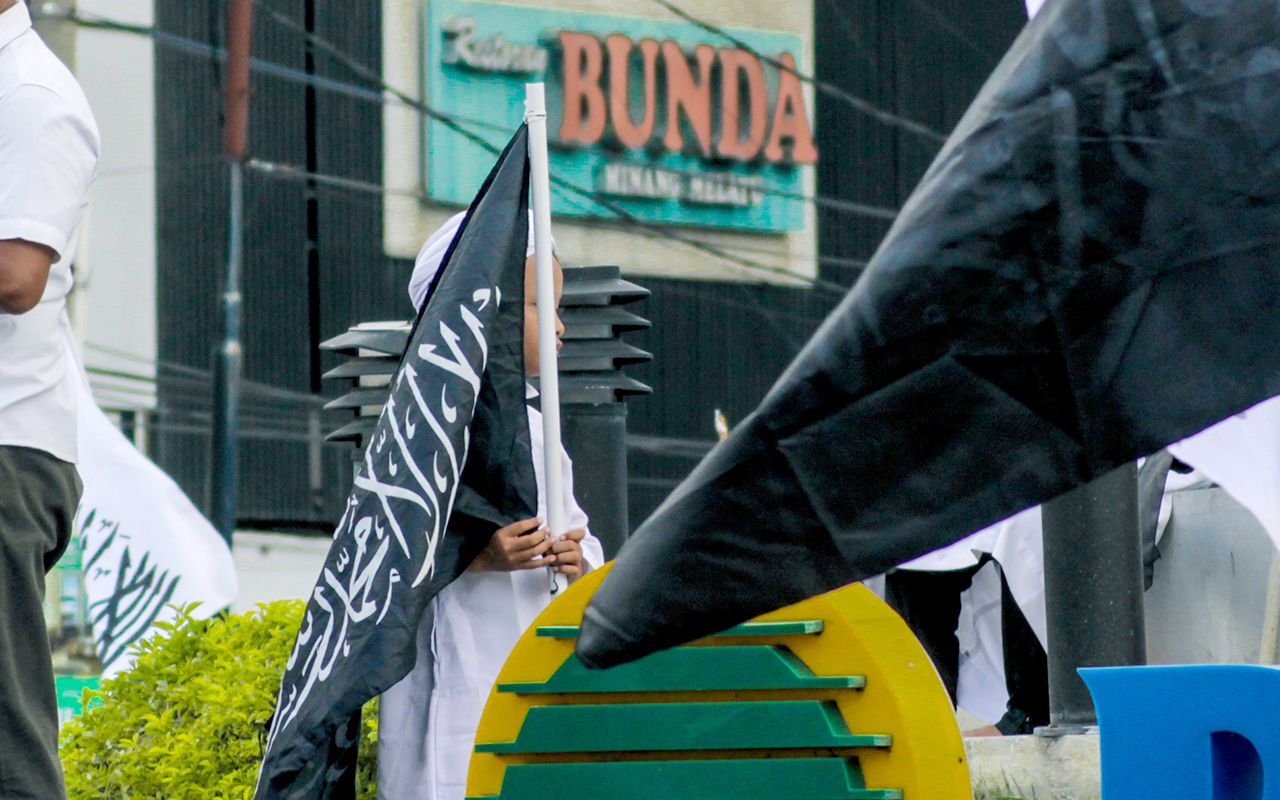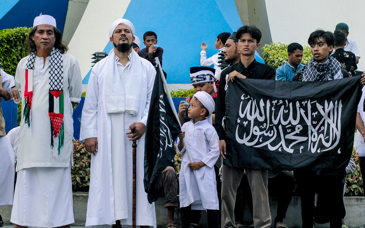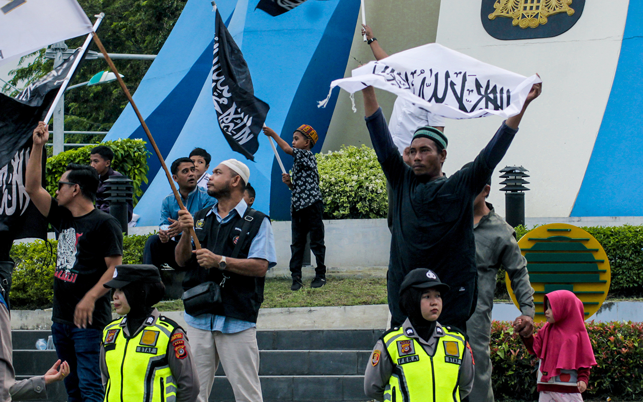 Anak-anak terlihat turut mengibarkan bendera berlafadz "Lailahaillallah Muhammadarrasulullah" dengan menggunakan ikat kepala bertuliskan Palestina. Aksi dilakukan di Simpang Lima Banda Aceh, Jumat (13/10).