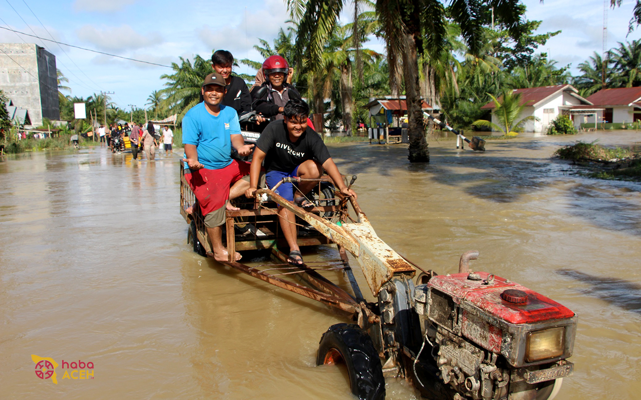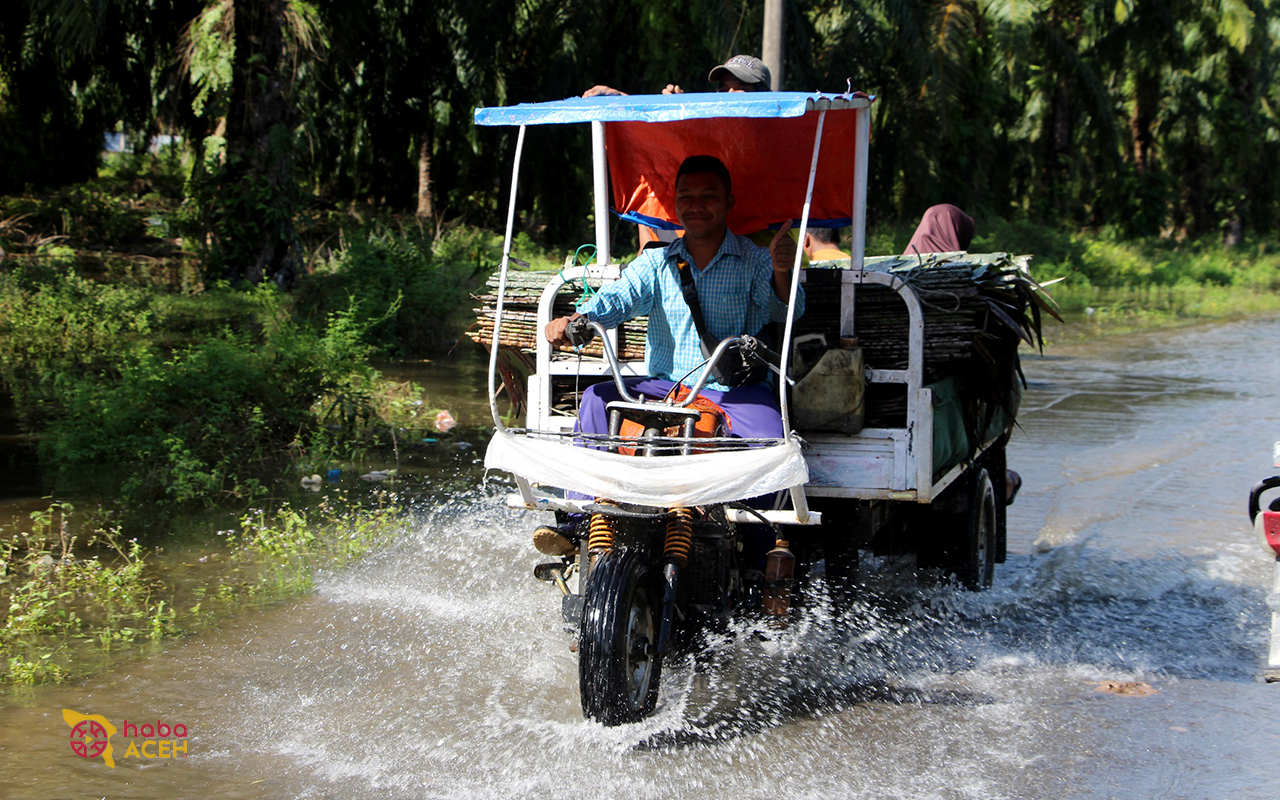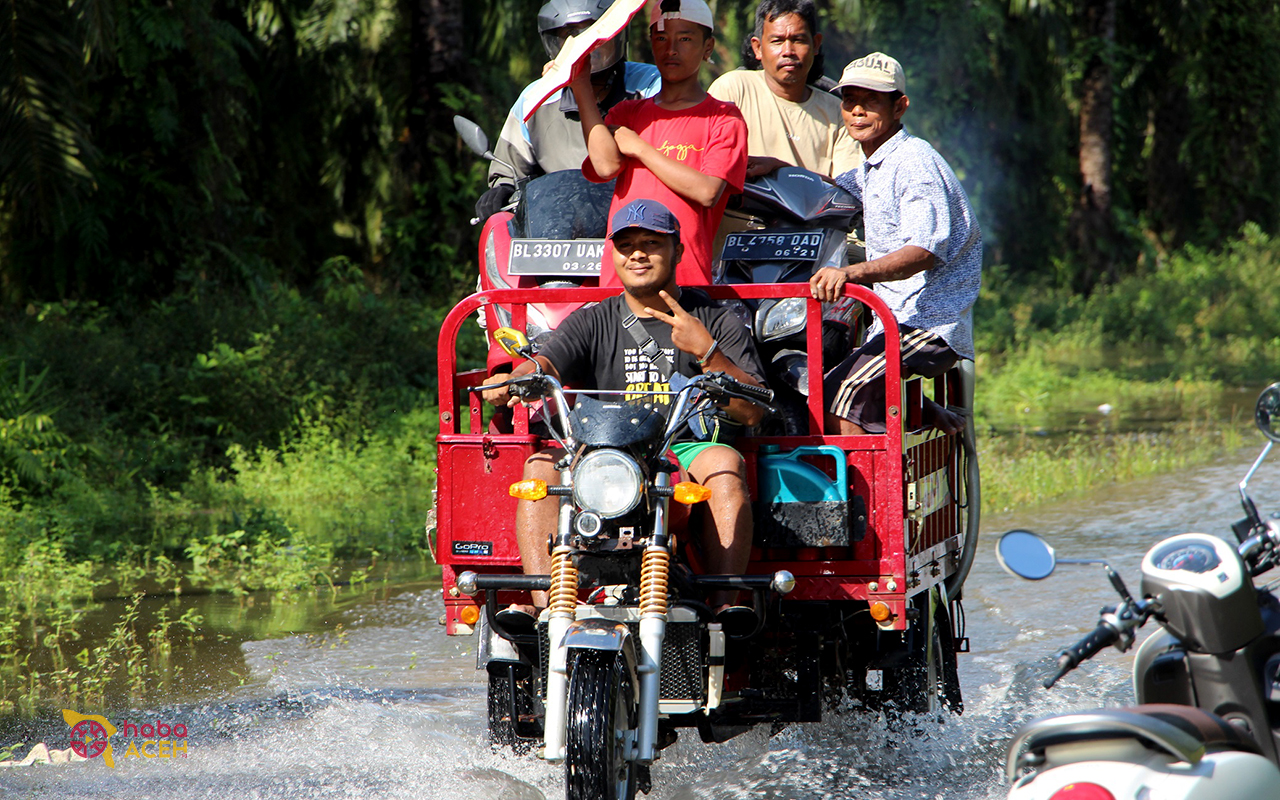Karang Baru – Sejumlah orang dan kendaraan diangkut menggunakan becak Viar, jetor bajak sawah hingga becak motor (panser) saat beraktivitas di tengah bencana banjir yang merendam Desa Gelung, Kecamatan Seruway, Aceh Tamiang, Sabtu (30/12/2023).