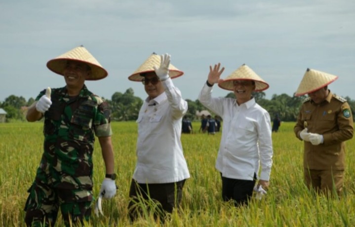 Aceh Barat Daya - Usai menghadiri Maulid Akbar di Mesjid Agung Kabupaten Aceh Barat Daya (Abdya), Wakil Menteri Pertanian (Wamentan) RI Harvick Hasnul Qolbi bersama Pj Gubernur Aceh Achmad Marzuki dan rombongan langsung menuju ke lokasi persawahan Lhung Tarok untuk melakukan panen raya padi bersama petani, Senin (21/11).