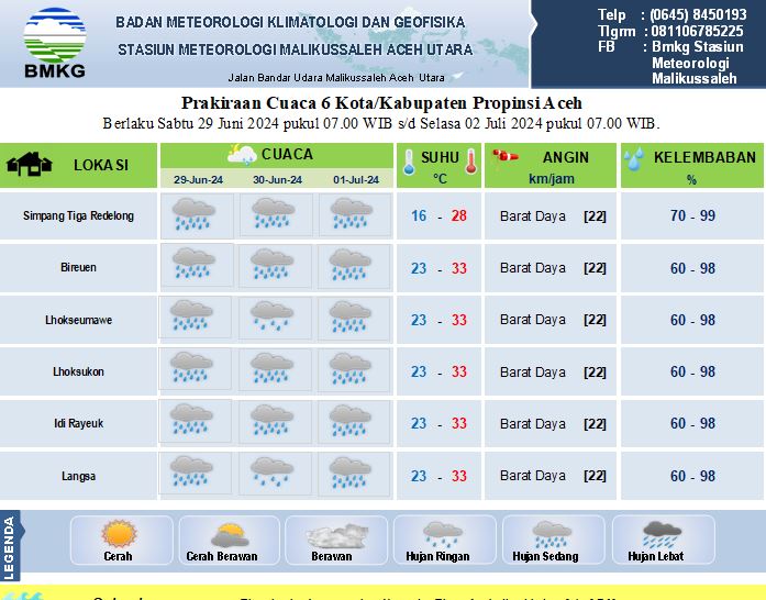 Berdasarkan prakiraan cuaca akan terjadi hujan ringan, sedang dan lebat di enam kabupaten/kota di Aceh pada Sabtu, 29 Juni hingga 2 Juli 2024.