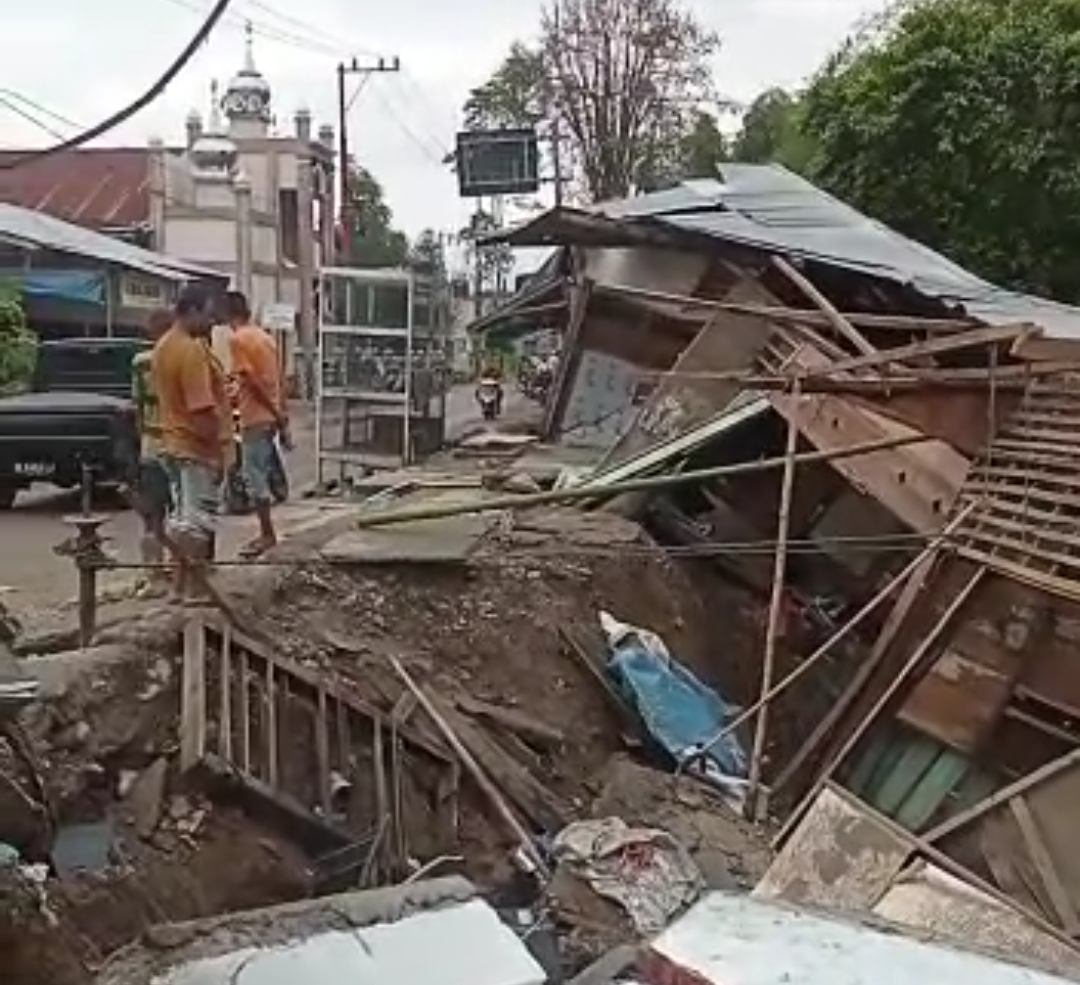 Selanjutnya di pusat pasar Kecamatan Kembang Tanjong, dilaporkan sebanyak enam unit bangunan kios juga ambles ke sungai.