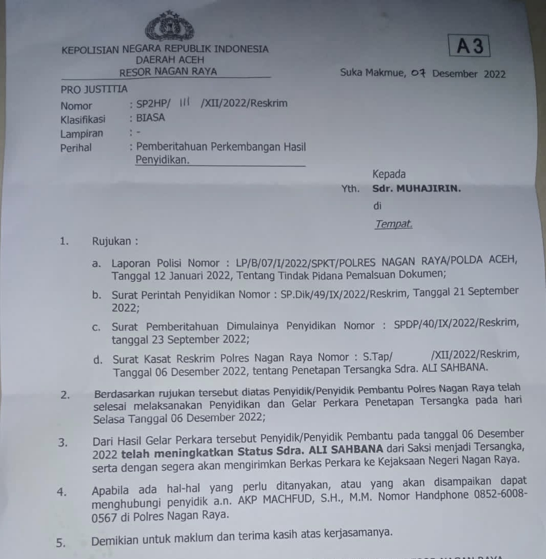 Dalam surat pemberitahuan perkembangan hasil penyelidikan, nomor SP2HP/III/XII/2022/Reskrim yang ditujukan ke Muhajirin, Keuchik Gampong Ujong Fatihah ditetapkan sebagai tersangka pada Selasa (6/12) lalu.