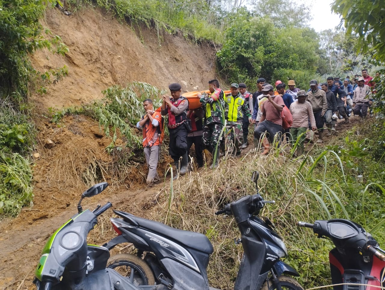Tim gabungan yang terdiri dari Sar, BPBD, Tagana, TNI, Polri, Brimob dan masyarakat sekitarnya sempat menghentikan upaya pencarian lantaran medan pencarian sangat sulit.