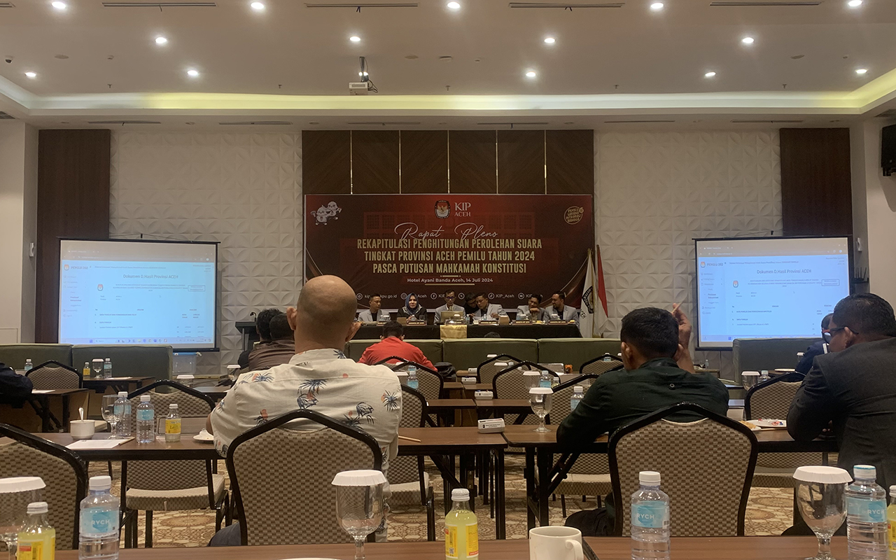 Foto: Rianza/HabaAceh.idBanda Aceh – Komisi Independen Pemilihan (KIP) Aceh menyampaikan hasil Rekapitulasi Penghitungan Ulang Surat Suara (PUSS) pasca putusan Mahkamah Konstitusi (MK) di Dapil 6 Aceh, Ahad (14/7).