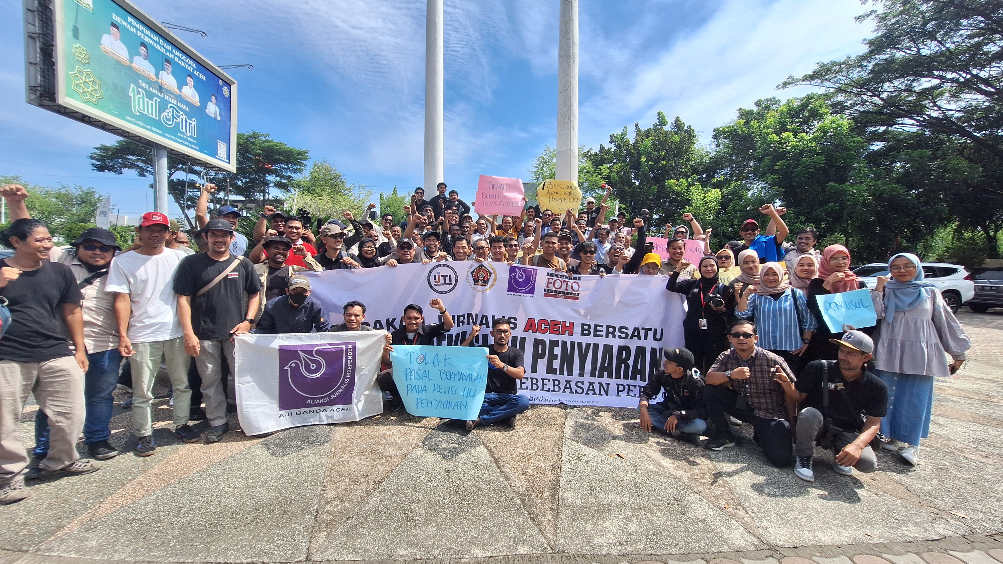 “Kami atas nama AJI, IJTI, PFI, dan PWI dengan tegas menyatakan menolak pasal-pasal bermasalah dalam revisi Undang-Undang Penyiaran yang sedang dibahas di DPR RI. RUU Penyiaran yang kontroversial mengancam kebebasan pers, demokrasi, dan HAM di Indonesia,” kata Ketua AJI Banda Aceh, Juli Amin.