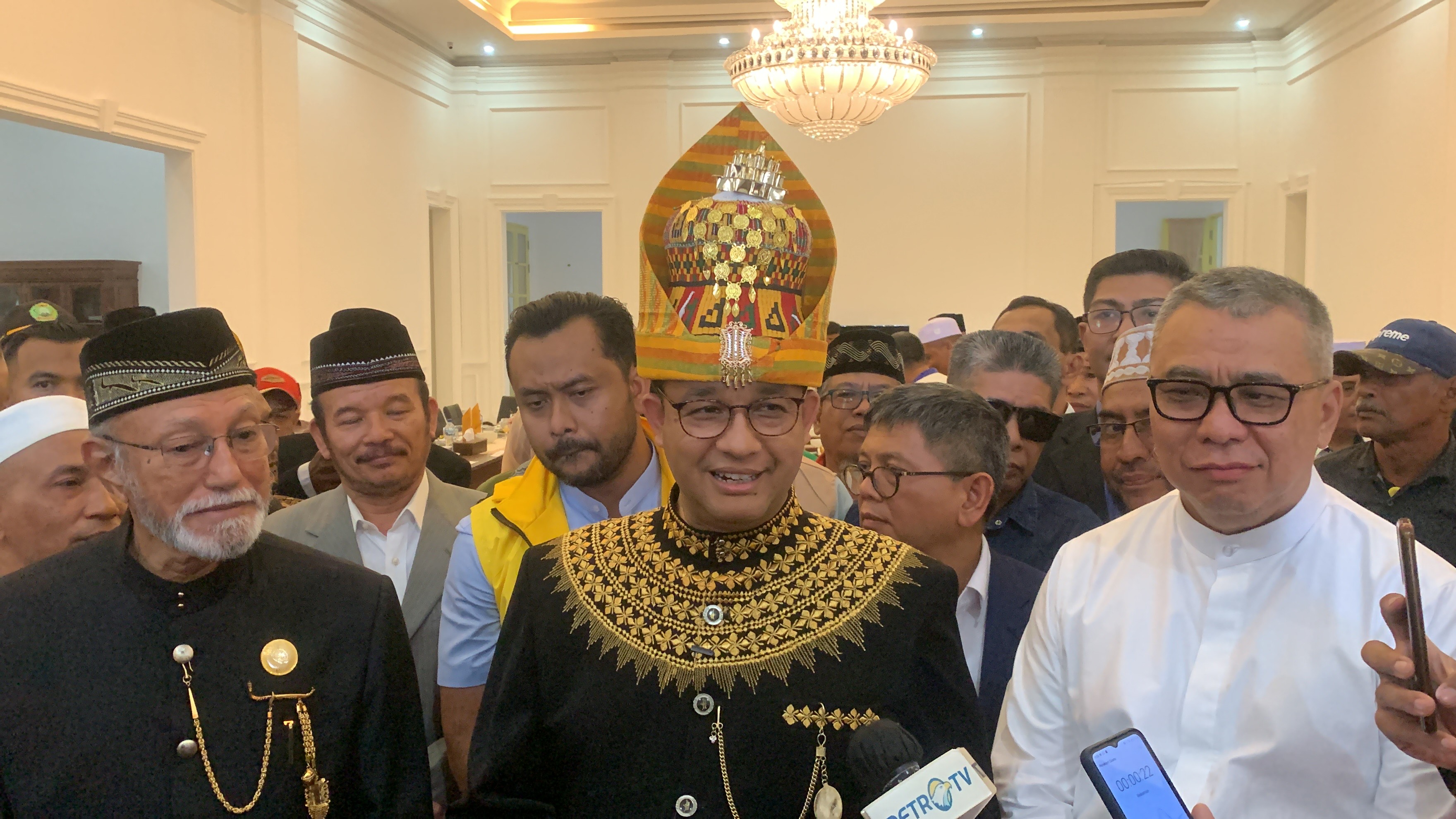 Pengamatan HabaAceh.id, saat berkunjung ke Meligoe Wali Nanggroe Aceh Anies tampak mengenakan pakaian adat Aceh, lengkap dengan kupiah meukeutop nya.
