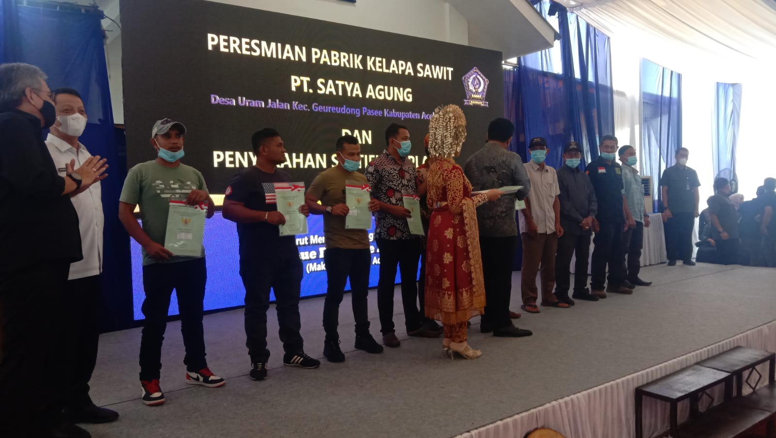 Sertifikat tanah itu dibagikan kepada 1000 petani Aceh Utara, namun secara simbolis hanya diserahkan kepada sepuluh petani. Penyerahan sertifikat itu dilakukan dalam peresmian Pabrik Kelapa Sawit PT. Satya Agung, Rabu (16/11) di Gampong Uram Jalan, Kecamatan Geureudong Pase.