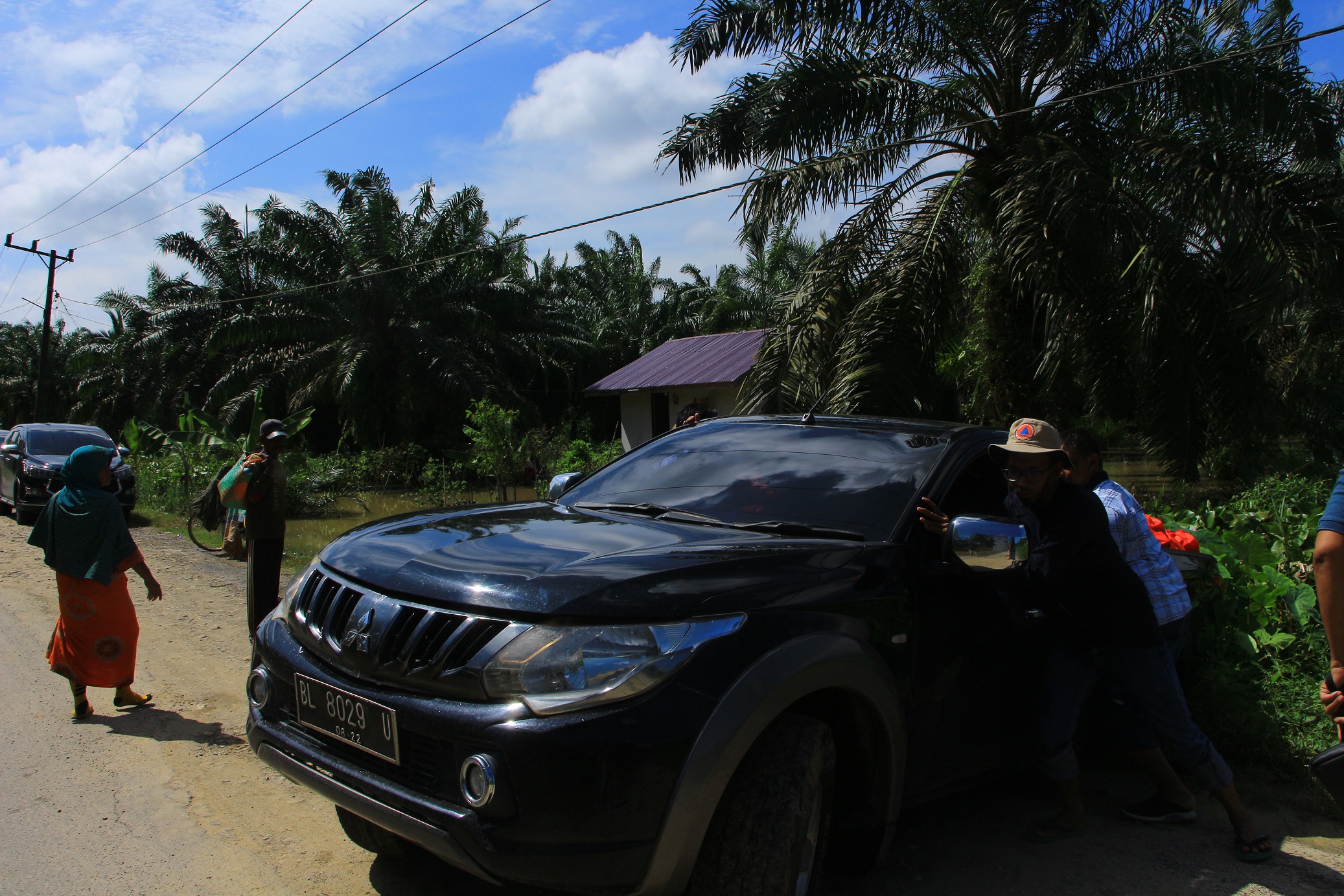 Posisi ban belakang makin dalam terbenam lumpur, hingga akhirnya sopir yang membawa Ketua DPRK Aceh Tamiang, Suprianto datang turut membantu.