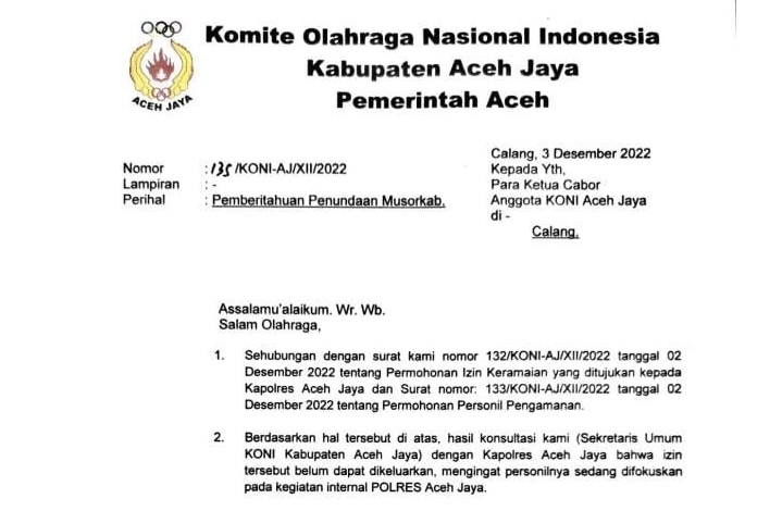 "Kami melakukan penundaan jadwal Musorkab KONI Aceh Jaya yang semula akan dilaksanakan pada 5 Desember 2022. Mengingat KONI Aceh Jaya akan fokus pada pelaksanaan PORA XIV di Pidie, maka untuk jadwal berikutnya akan dilaksanakan setelah PORA XIV di Pidie," bunyi isi surat itu.