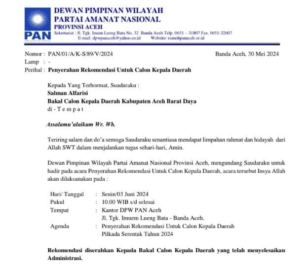 Dalam surat nomor:PAN/01/A/K-S/89/V/2024  yang diteken Ketua DPW PAN Aceh, Mawaradi Ali serta Irfanusir sebagai Sekretaris meminta agar Salman Alfarisi untuk hadir pada Senin (3/6) di Kantor DPW PAN Aceh sekira pukul 10.00 WIB.