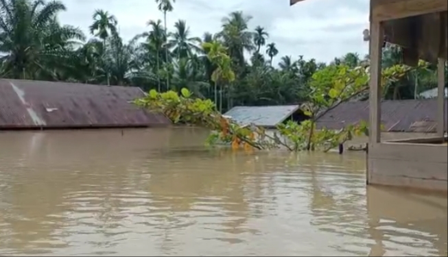 “Banjir sudah masuk dalam pekarangan sejak kemarin, hingga saat ini air sudah mencapai atap balai pengajian,” katanya.