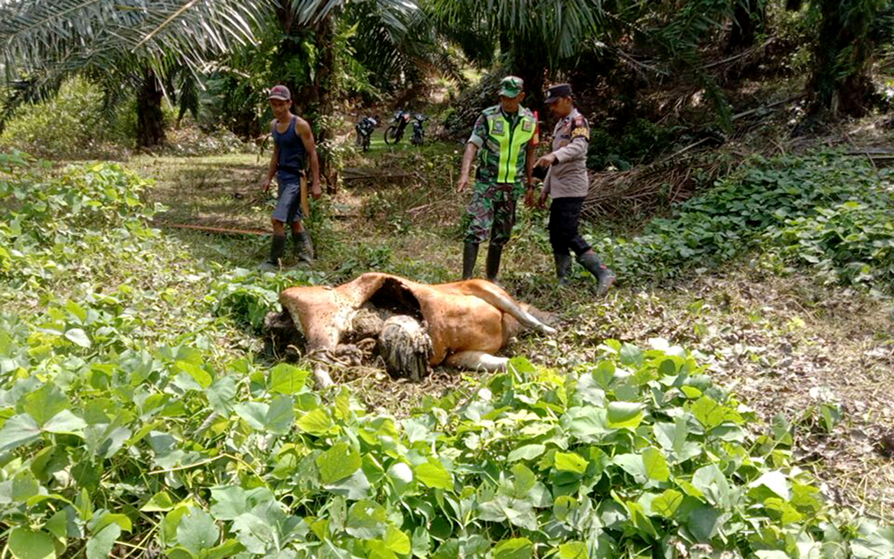 Foto: Dok Humas Polres Aceh TimurLhokseumawe - Seekor sapi betina milik Abu Hurairah asal Dusun Buket Panyang, Gampong Panton Rayeuk T, Kecamatan Banda Alam, Aceh Timur, ditemukan mati di area perkebunan sawit Afdelling I Julok Rayeuk Selatan pada hari Rabu (28/05) malam.