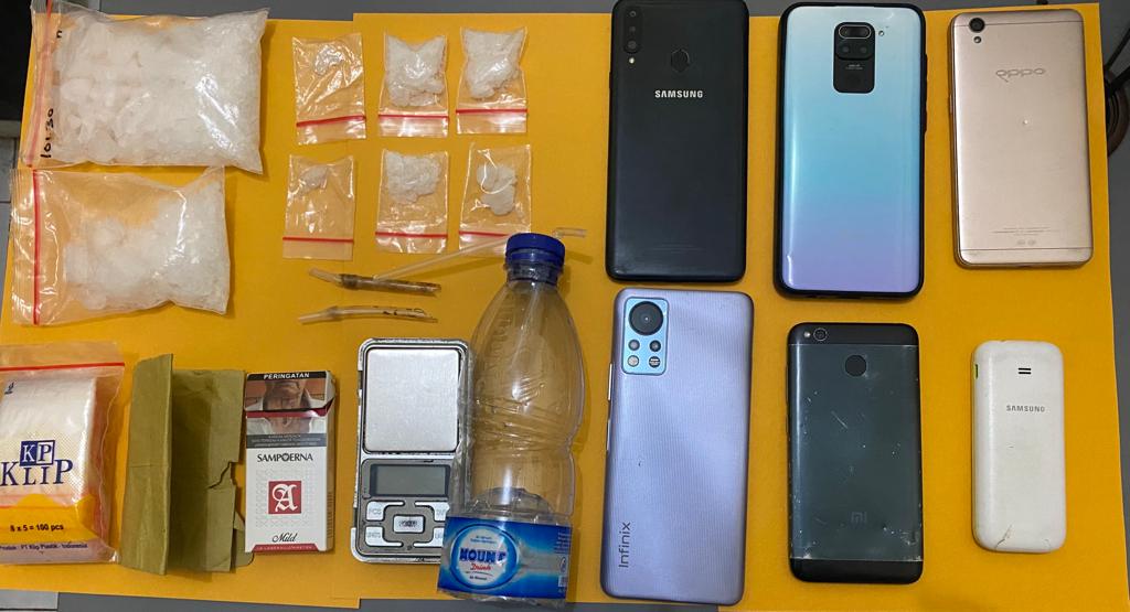 “Dari tersangka polisi menemukan barang bukti berupa satu buah timbangan digital, satu pack plastik transparan berles warna merah, satu buah bong (alat hisap sabu) dan enam unit ponsel,” kata Hadimas, Senin (14/11).