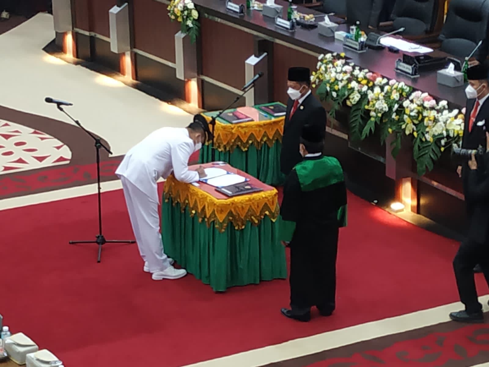 Pj Gubernur Aceh, Achmad Marzuki saat menandatangi fakta integritas usai dilantik Mendagri, Tito Karnavian di Gedung DPR Aceh, Rabu (6/7/2022).